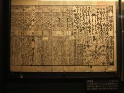 右写真は春海が制定した貞享暦に基づいた暦。それまで日本の暦は中国から輸入したものをそのまま使っていたのですが、渋川春海はこれを初めて日本人の手で編纂したのでした。展示されているのは春海の没後の享保14(1729)年版。春海の定めた貞享歴は70年間使用されます。